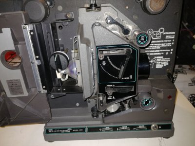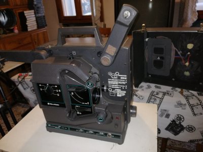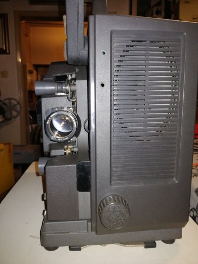Proiettore per pellicole cinematografiche 16mm, sonoro ottico, inserimento facilitato automatico Super Slim Slot Load, lampada alogena 250 w, altoparlante sul coperchio.